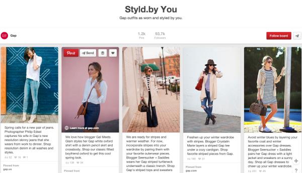 Similarly, in the example above, for those of you who enjoy exploring the fashion world, Gap has created this collaborative Pinterest Board, where fashion bloggers and clothing enthusiasts post pics to display how they wear the Gap clothing.