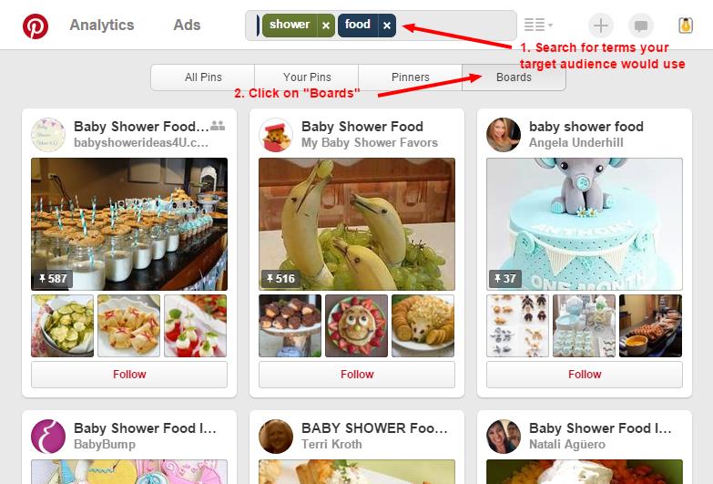 These like-minded users can be found through Pinterest Search, by looking for boards and Pins related to your niche. An example below illustrates how it is done;