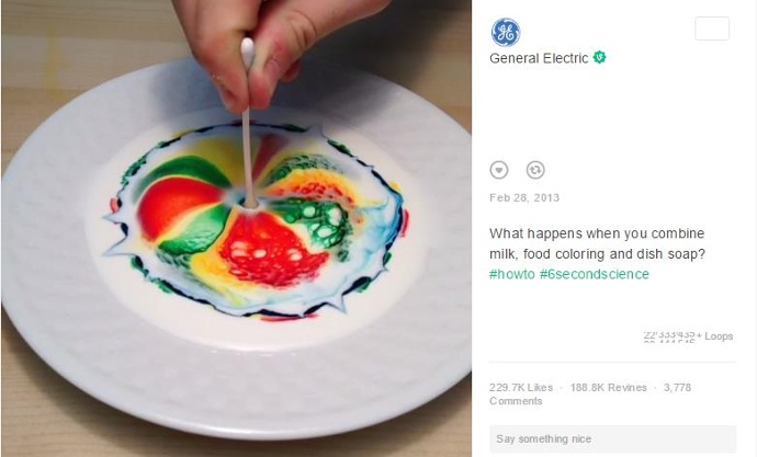The example below is one of such vines of the campaign, where milk, food colouring and dish soap is combined to bring about a colourful spectacle.