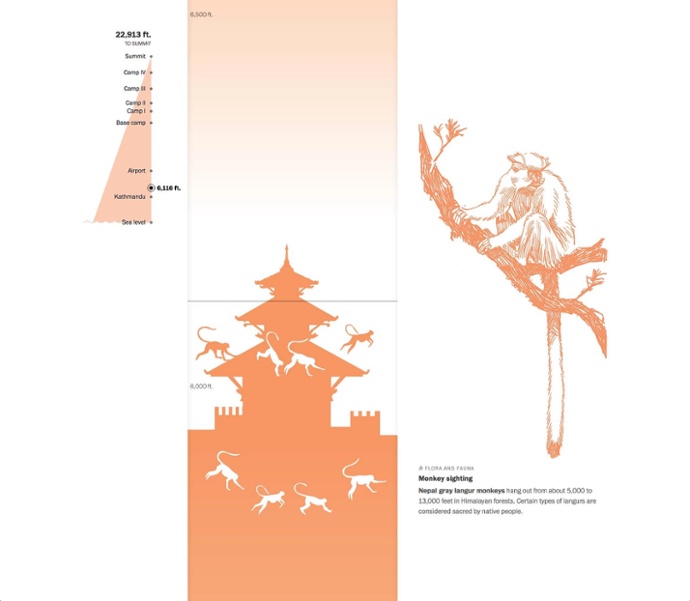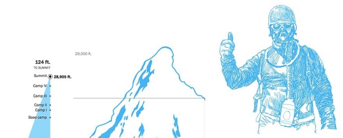 A superb example of an ‘interactive’ infographic is the Washington Post’s ‘Scaling Everest’ infographic. It's a dynamic content which showcases and invites you to experience what the climbers actually face throughout the journey, right from the sea level to the summit of Everest at 29,029 feet high.